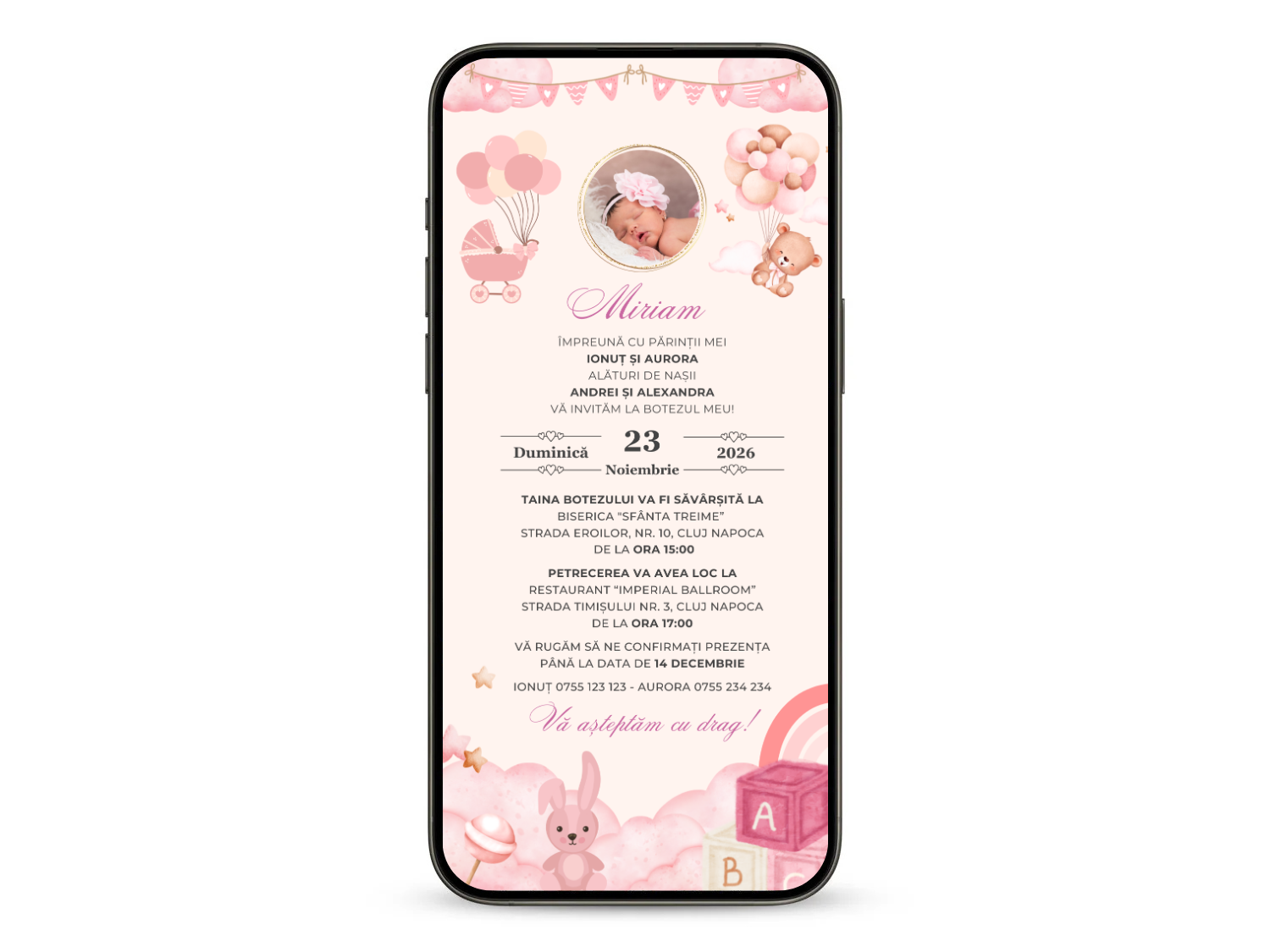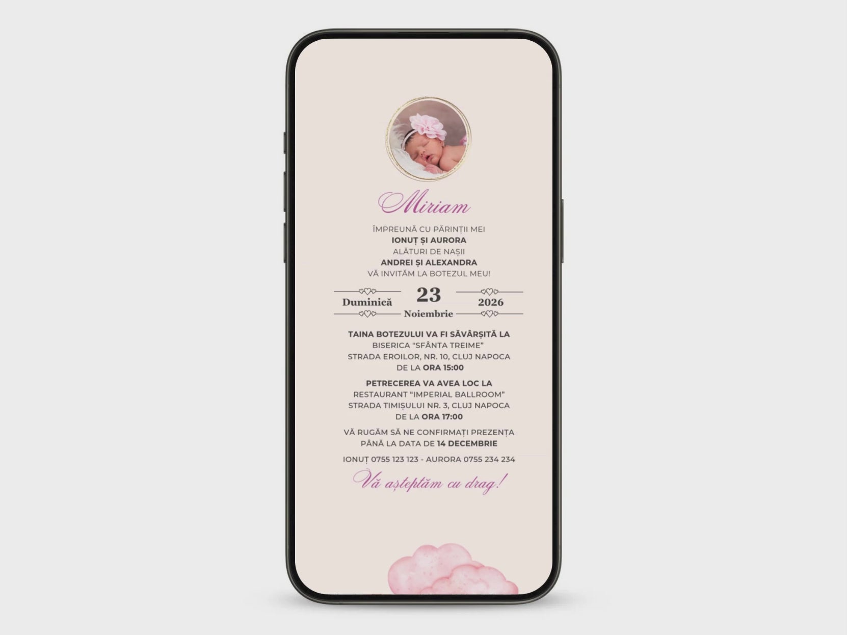 - Invitația poate fi adaptată și la alte evenimente (ex: zi de naștere, moț, turtă, baby shower)