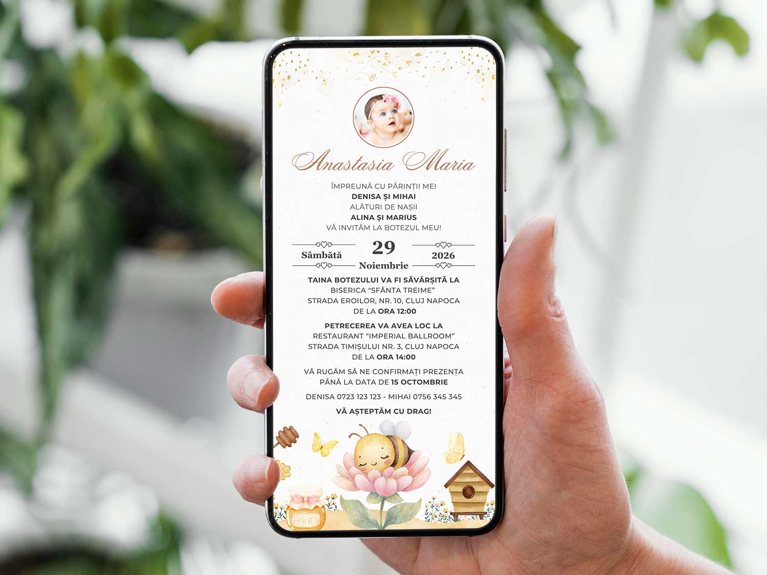 - Invitația poate fi adaptată și la alte evenimente (ex: zi de naștere, moț, turtă, baby shower)