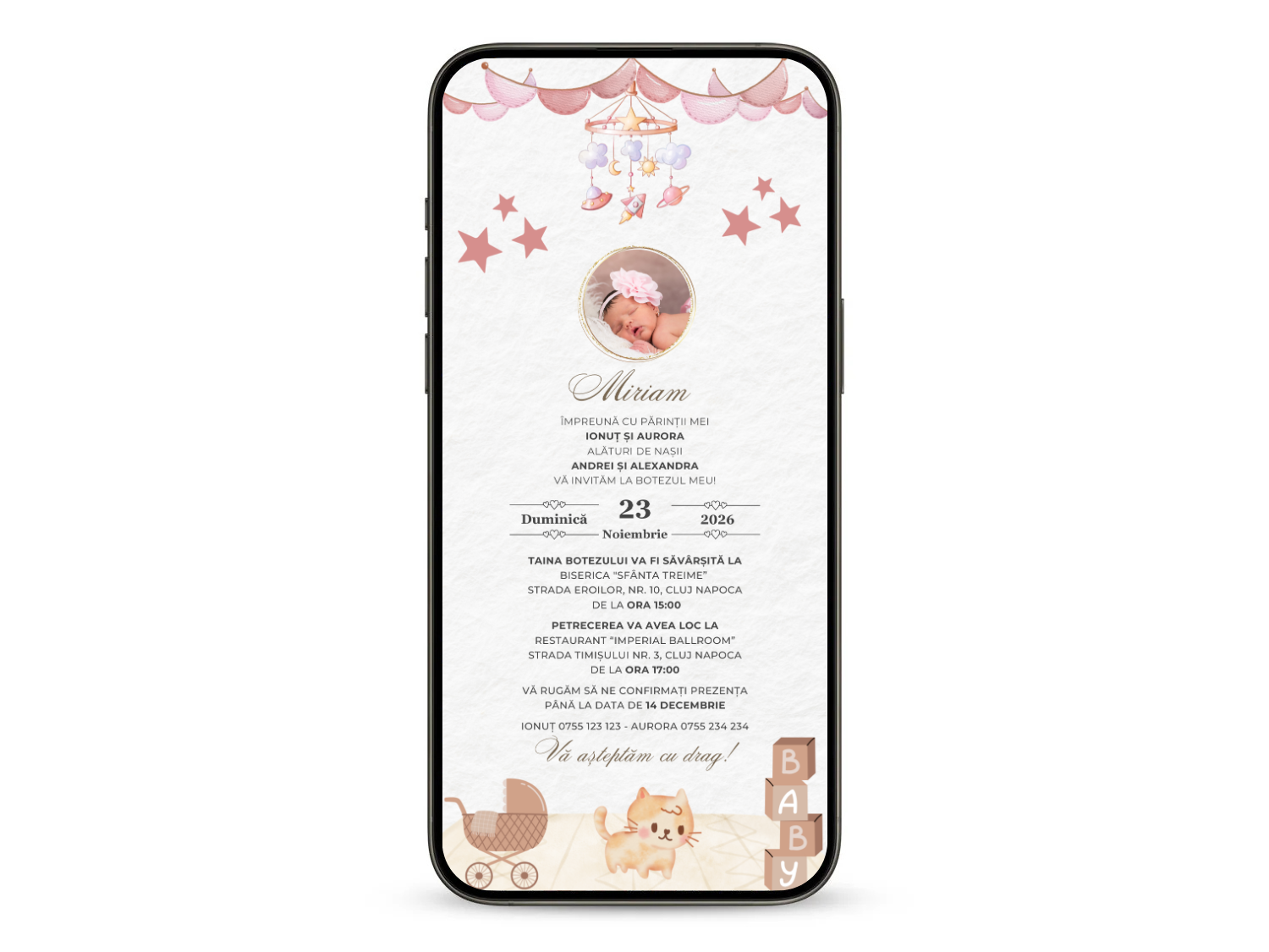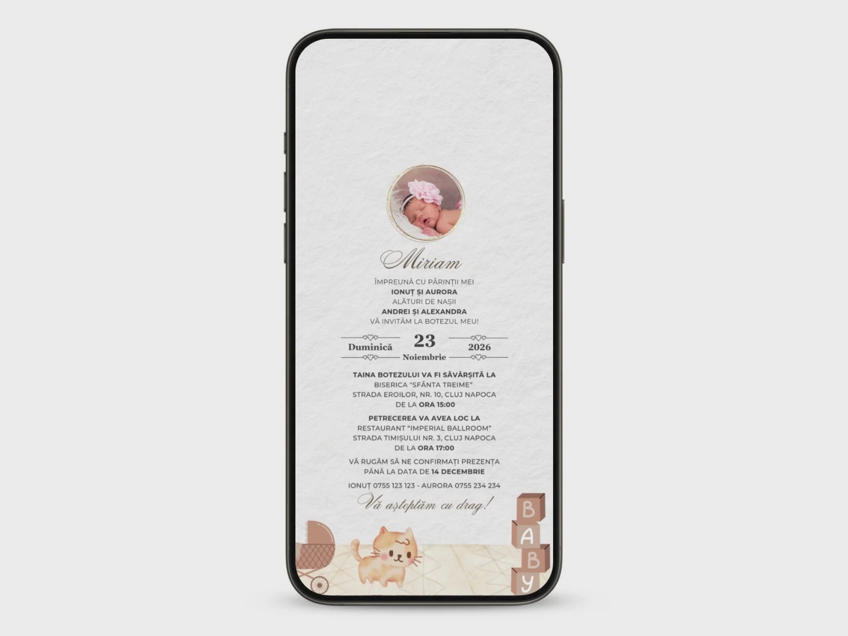 - Invitația poate fi adaptată și la alte evenimente (ex: zi de naștere, moț, turtă, baby shower)