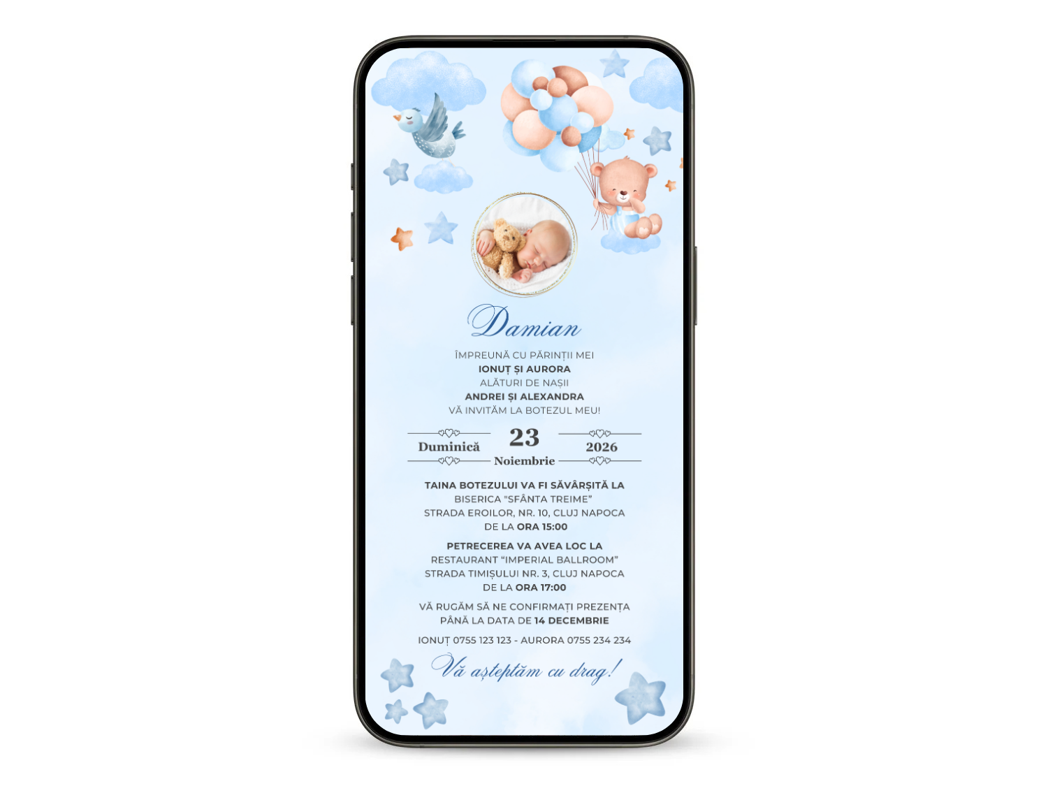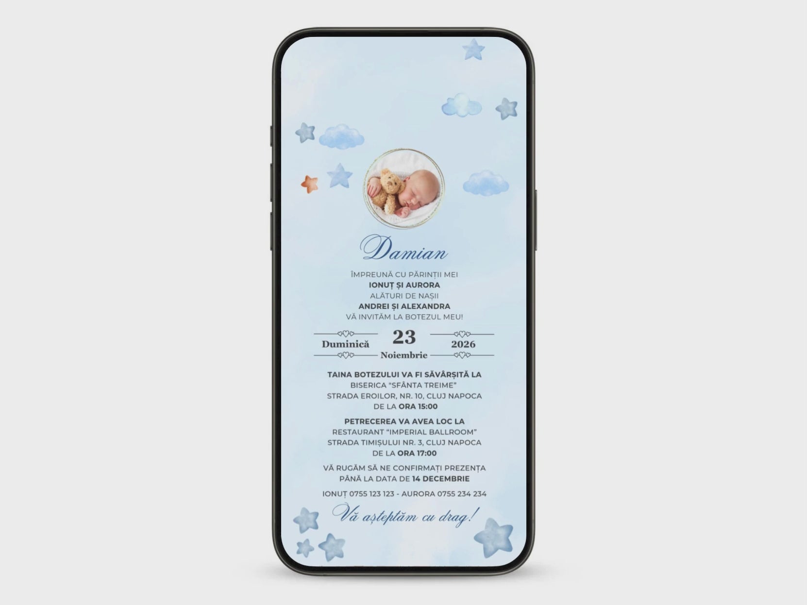 - Invitația poate fi adaptată și la alte evenimente (ex: zi de naștere, moț, turtă, baby shower)