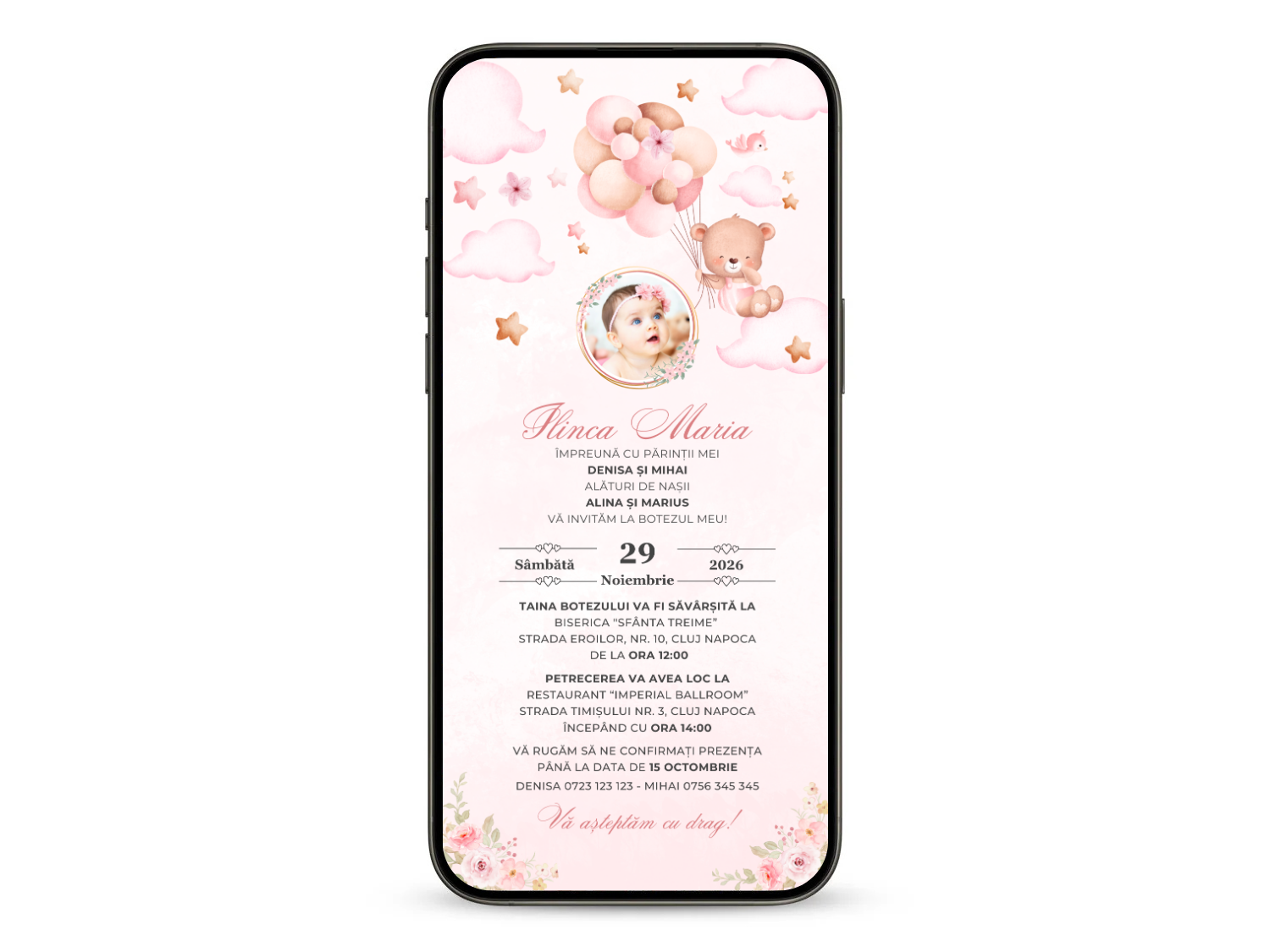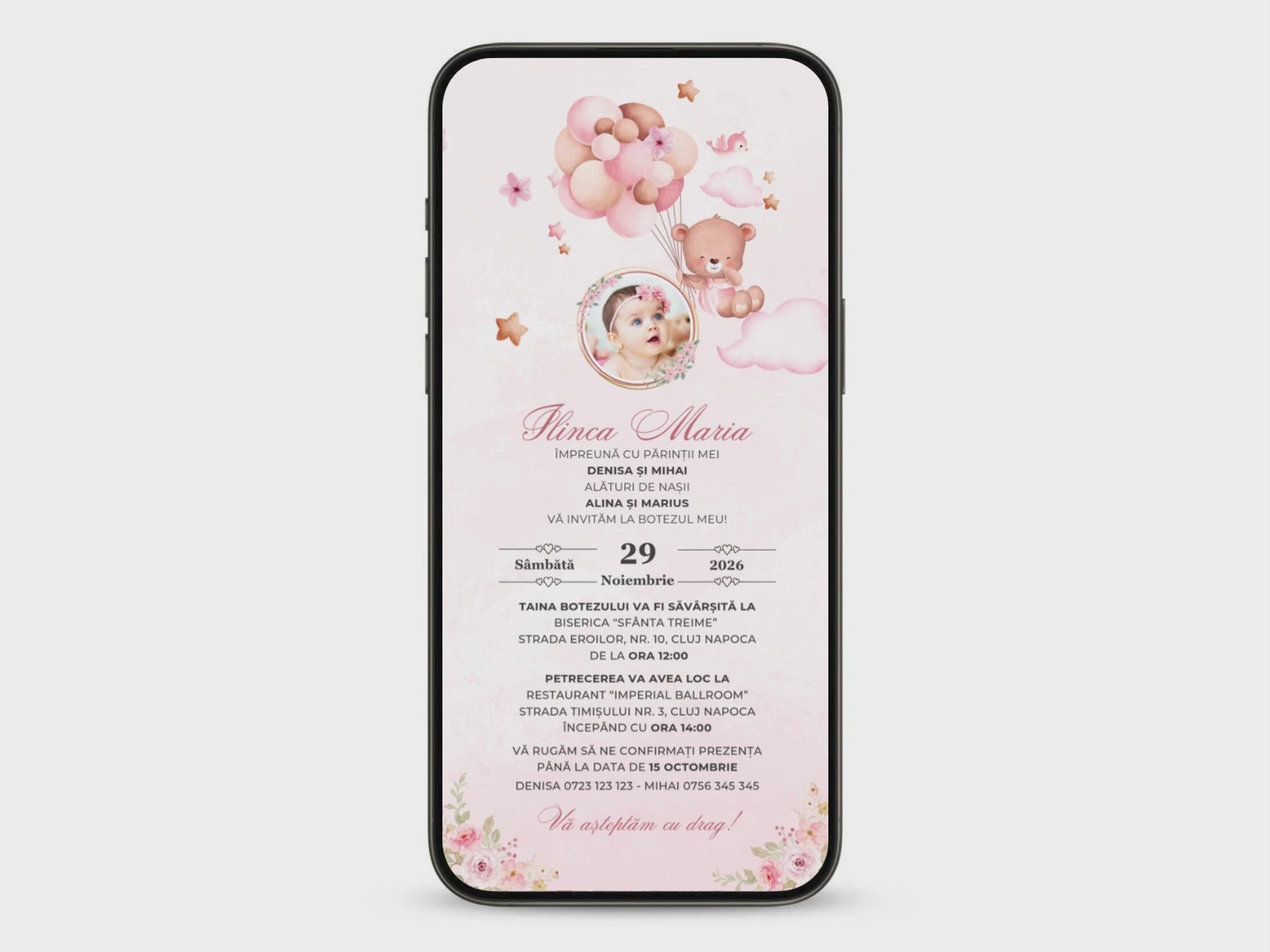 - Invitația poate fi adaptată și la alte evenimente (ex: zi de naștere, moț, turtă, baby shower)