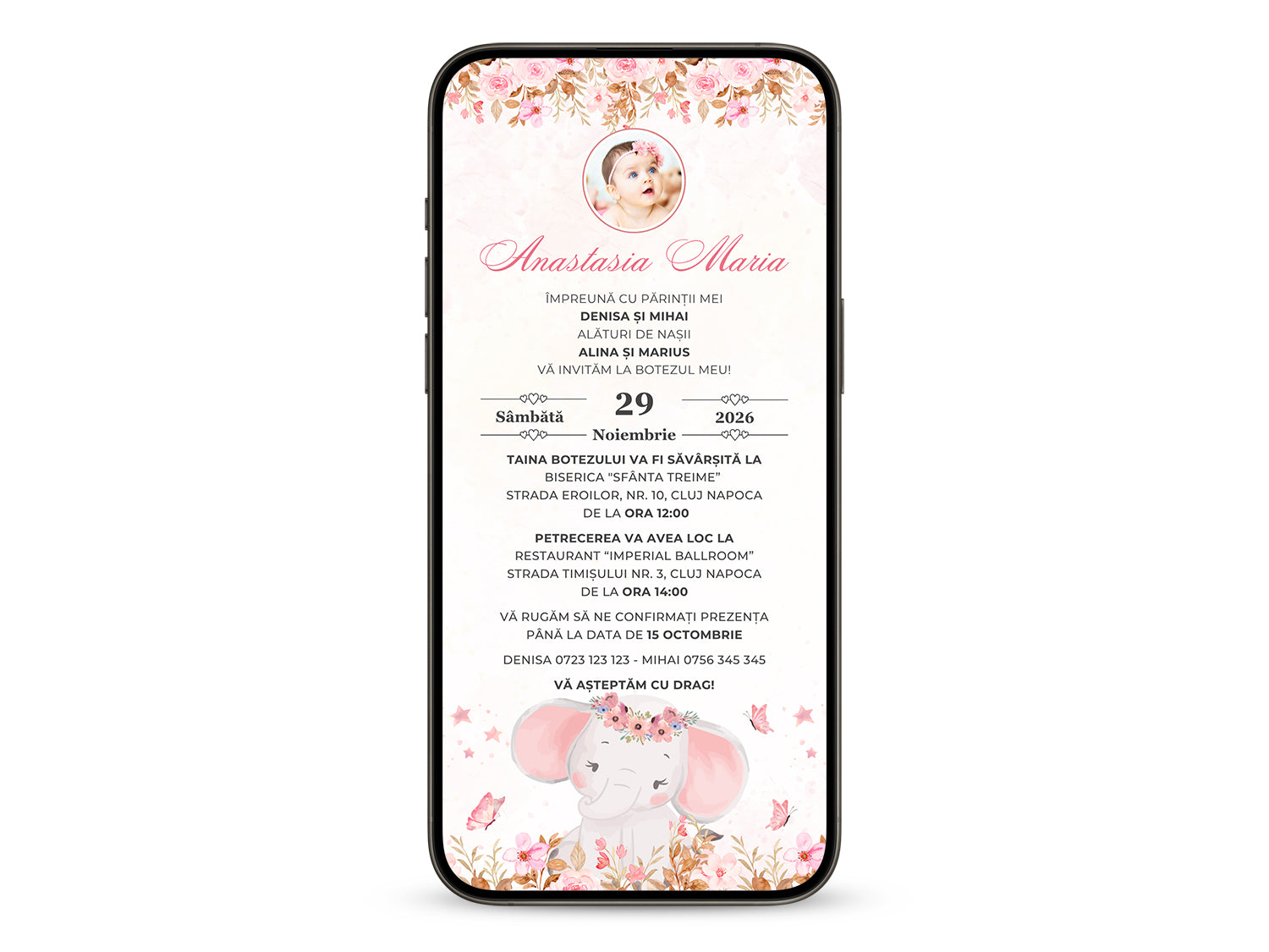 - Invitația poate fi adaptată și la alte evenimente (ex: zi de naștere, moț, turtă, baby shower)