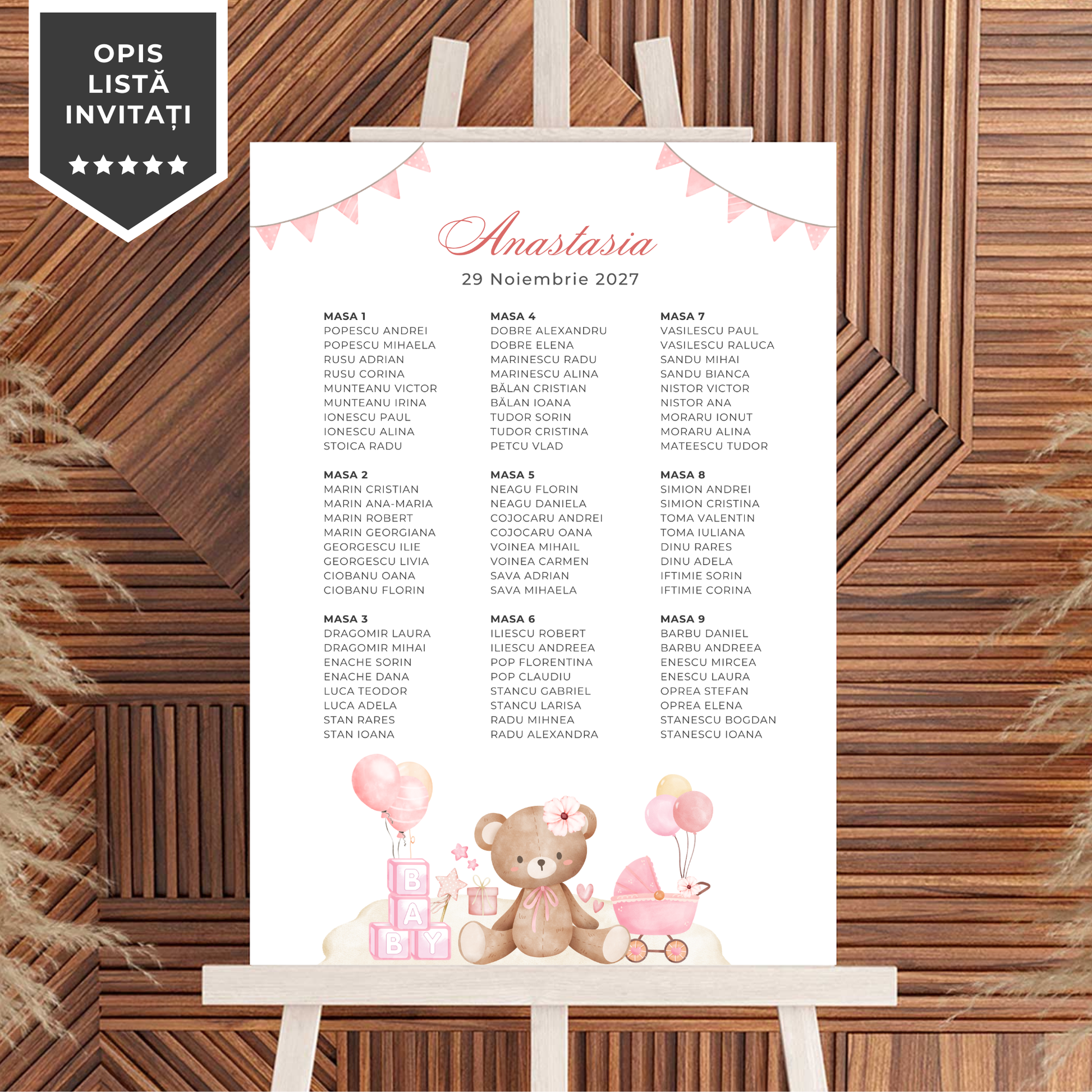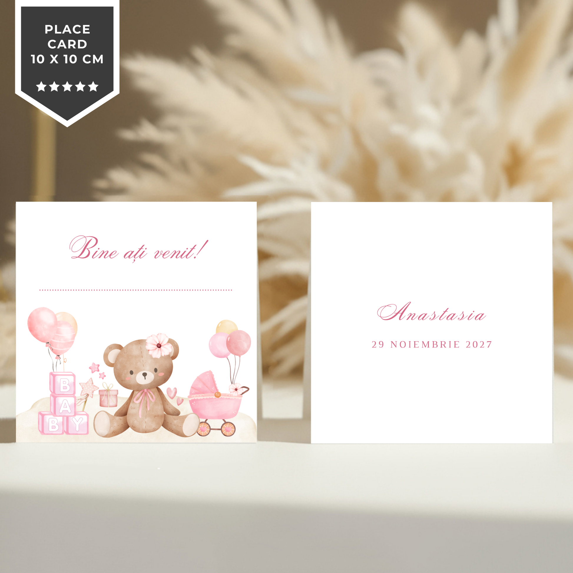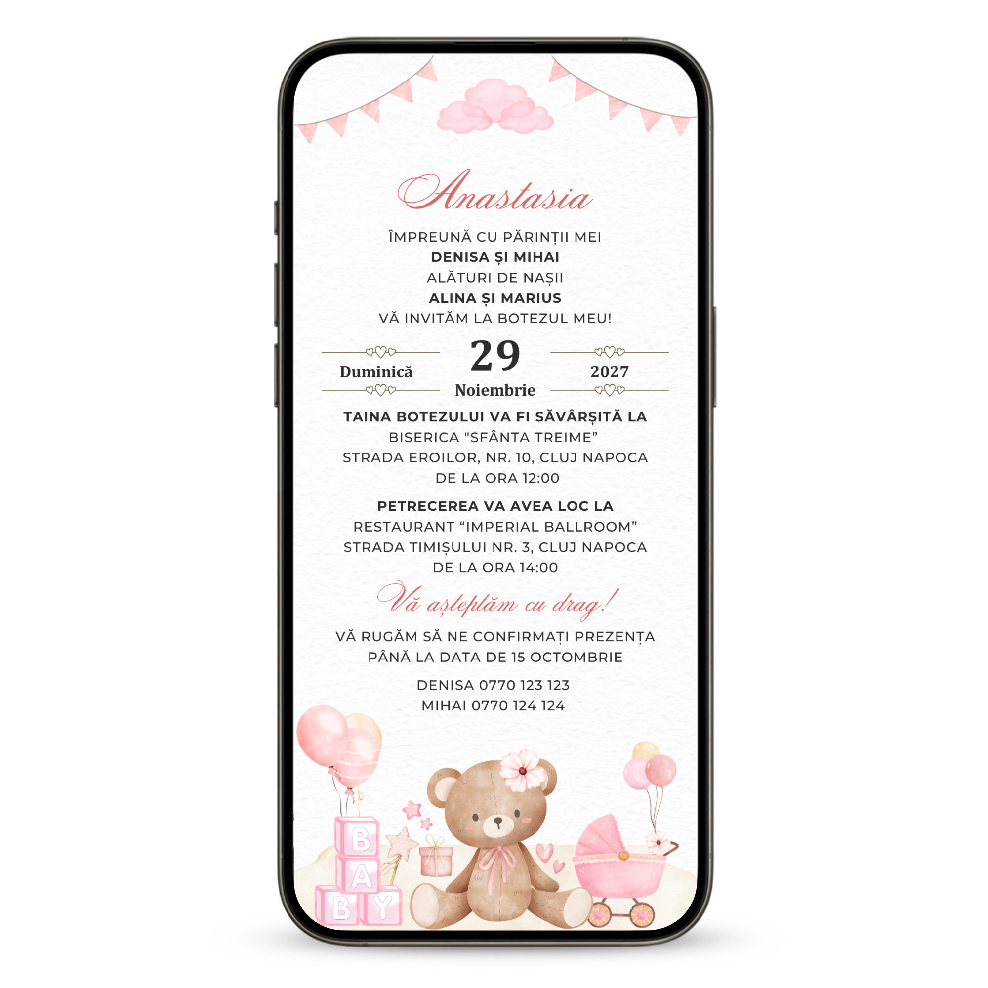 Maria B. Invitatie Botez Ursuletul Jucaus Baby Girl, Format Digital