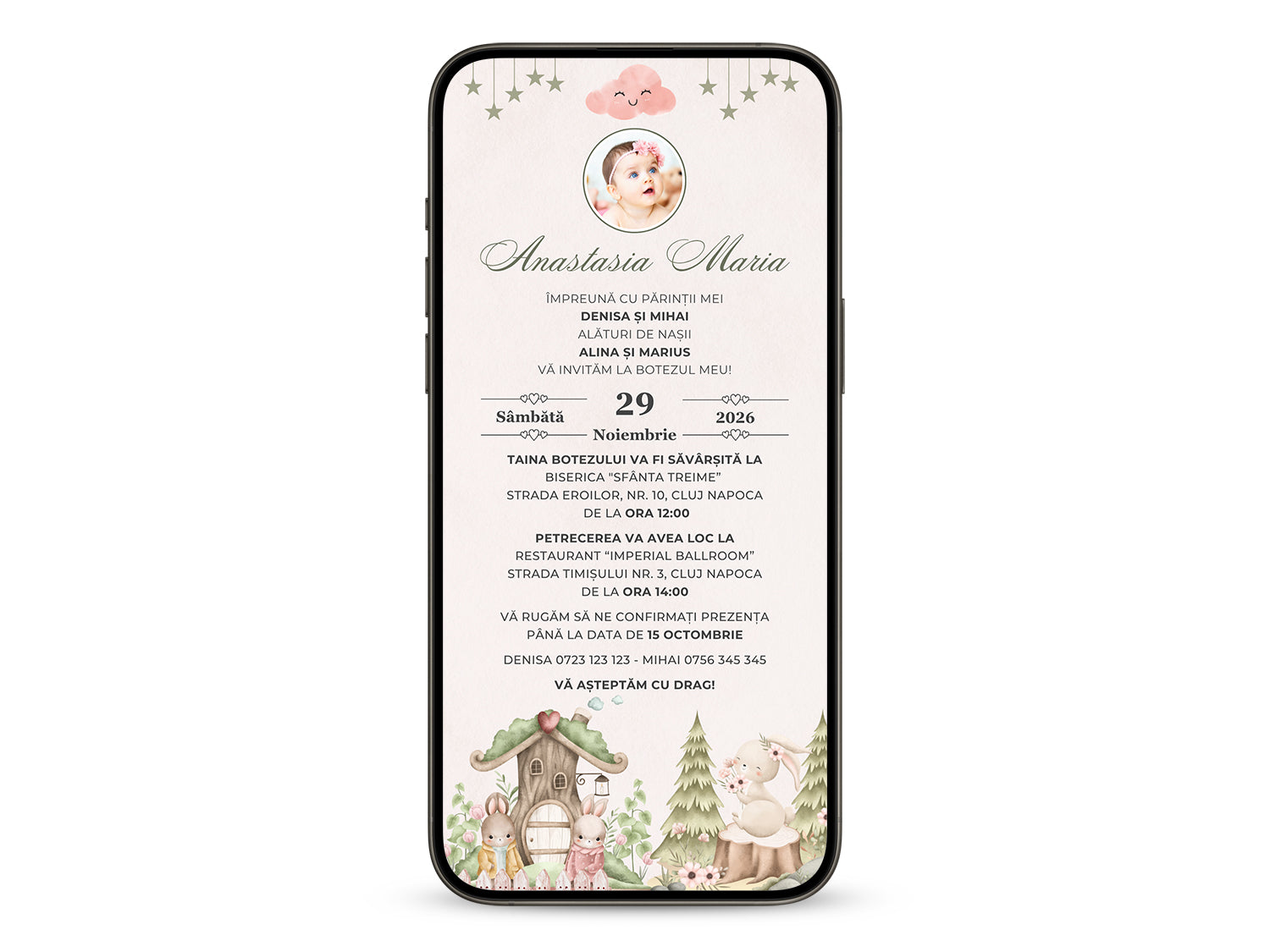 - Invitația poate fi adaptată și la alte evenimente (ex: zi de naștere, moț, turtă, baby shower)