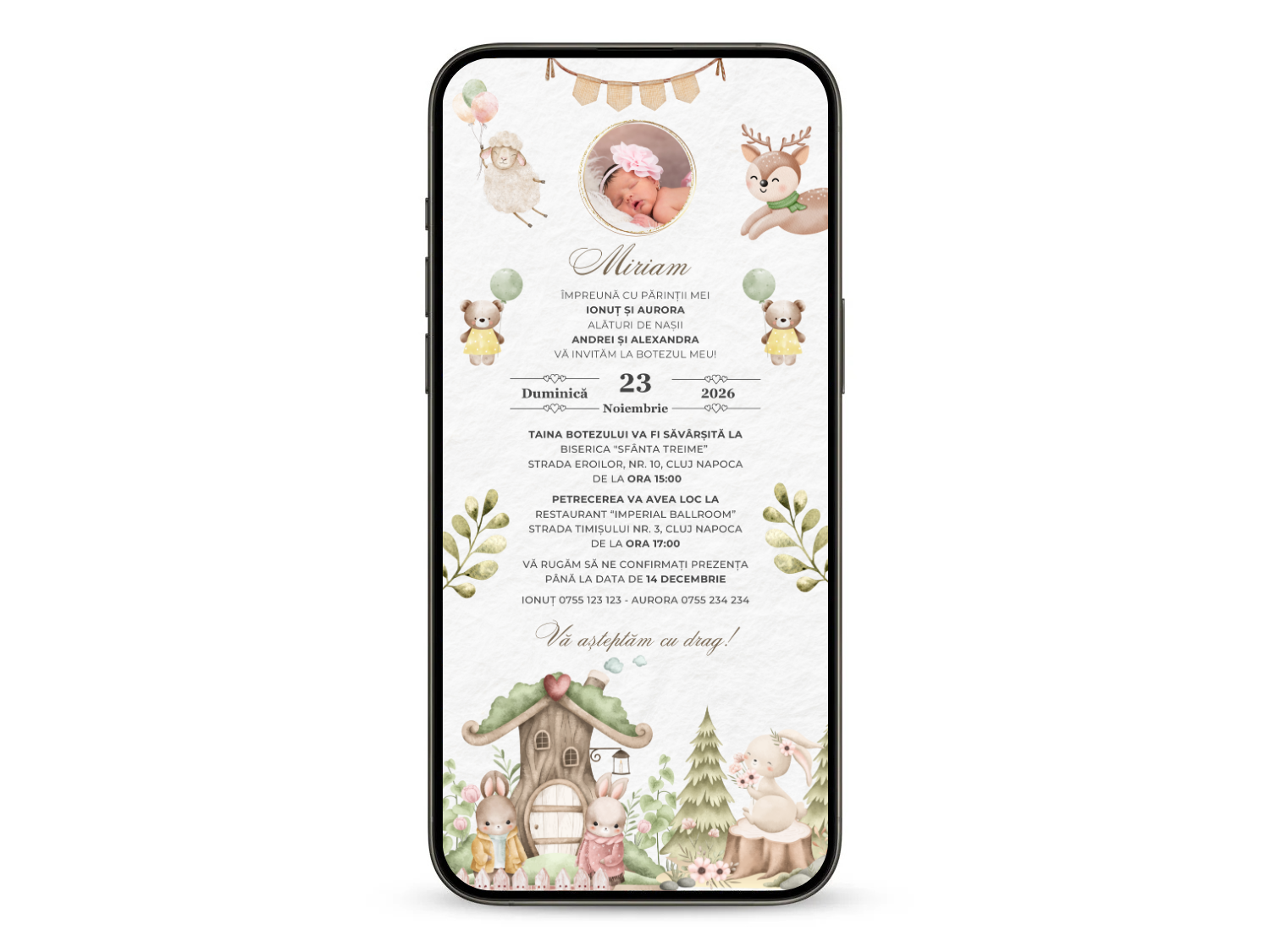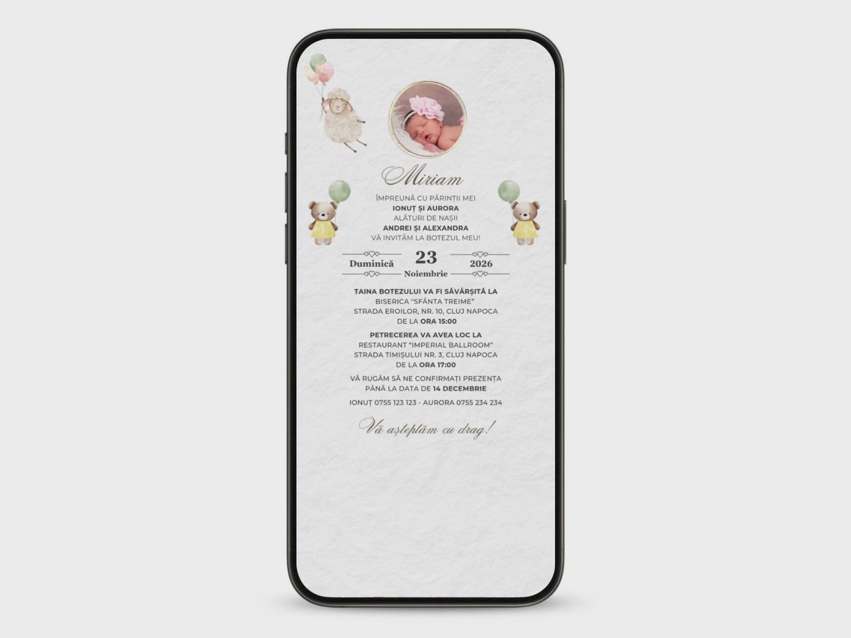 - Invitația poate fi adaptată și la alte evenimente (ex: zi de naștere, moț, turtă, baby shower)