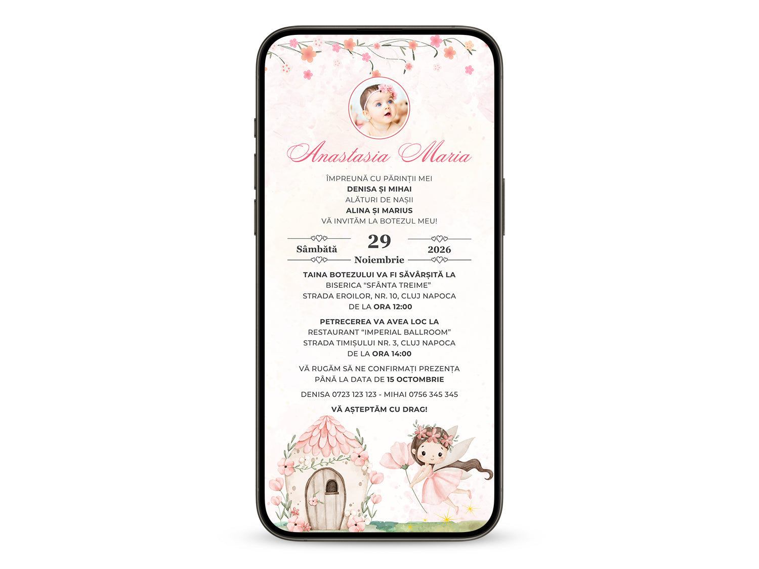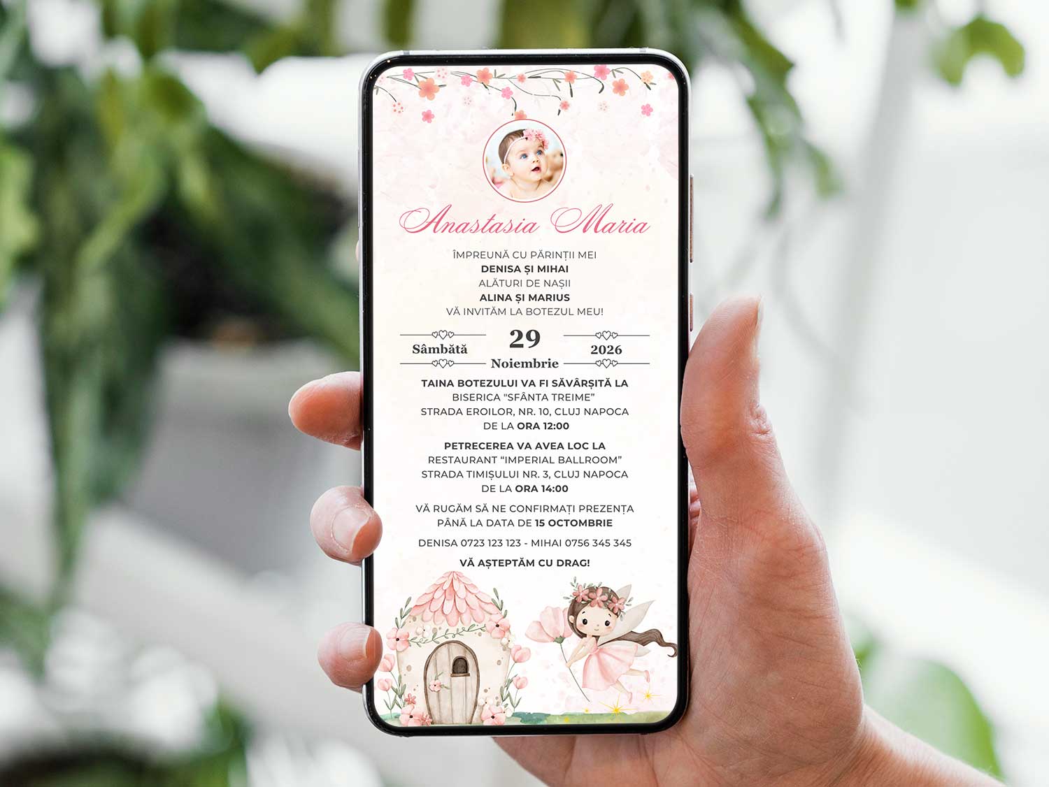 - Invitația poate fi adaptată și la alte evenimente (ex: zi de naștere, moț, turtă, baby shower)