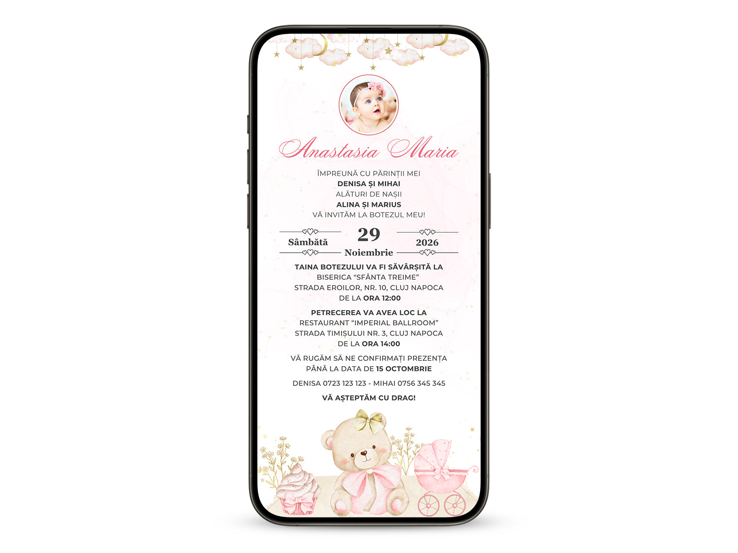- Invitația poate fi adaptată și la alte evenimente (ex: zi de naștere, moț, turtă, baby shower)