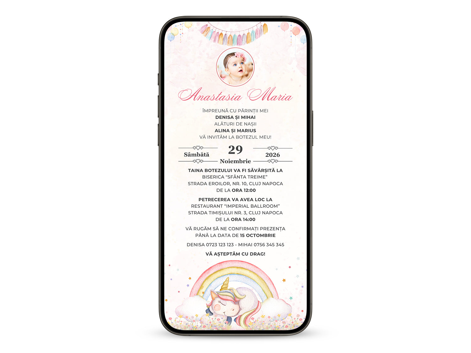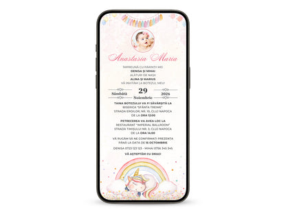 Invitatie Botez Unicorn Baby, Format Digital