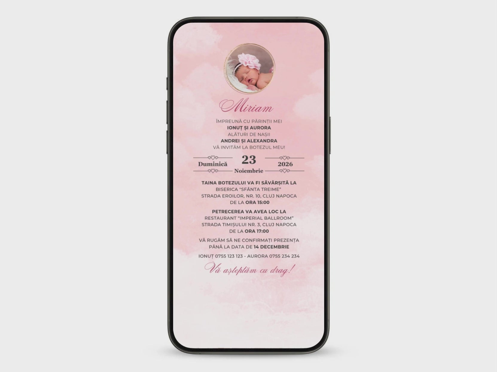 - Invitația poate fi adaptată și la alte evenimente (ex: zi de naștere, moț, turtă, baby shower)